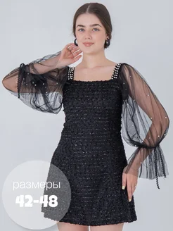 Платье нарядное вечернее с прозрачными рукавами и жемчугом