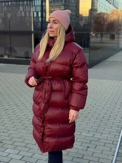 Куртка бордовая дутая на поясе удлиненная