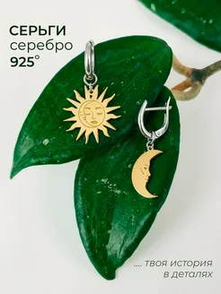 Серебряные серьги солнце и луна 925 пробы с позолотой