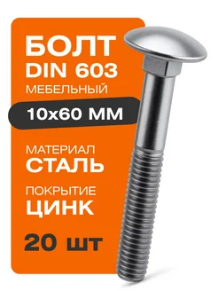 Болты мебельные м10х60 мм DIN 603 20 шт. покрытие цинк