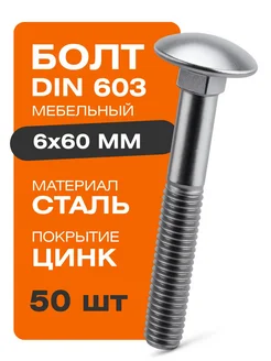 Болты мебельные м6х60 мм DIN 603 50 шт цинк