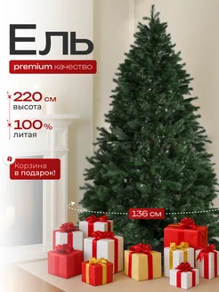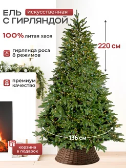 Елка искусственная новогодняя, литая 220 см, с гирляндой