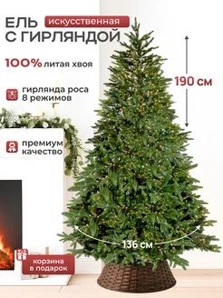 Елка искусственная новогодняя, литая 190 см, с гирляндой