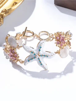 Браслет с белой морской звездой и ракушкой в розовых стразах