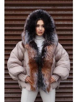 Куртка укороченная, натуральный мех, пуховик с капюшоном