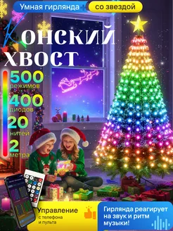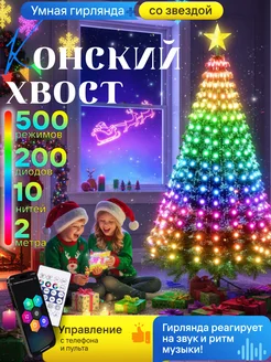 Умная гирлянда на елку Конский Хвост со звездой 2 метра