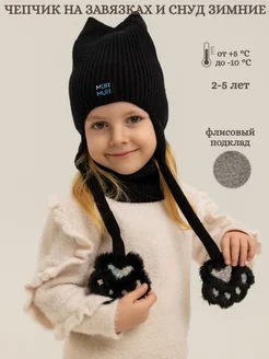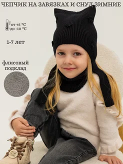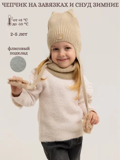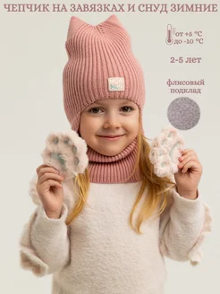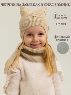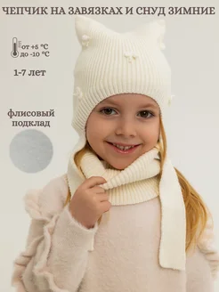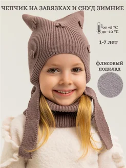 Чепчик с ушками на флисе с бантиками и снуд зимние