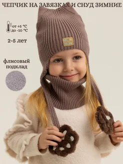 Чепчик с ушками на флисе с лапками и снуд зимние