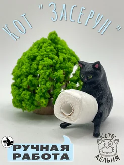 Черный кот с туалетной бумагой фигурка, ручная работа