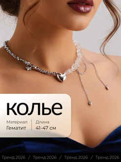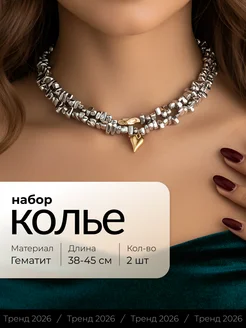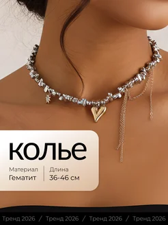 Колье из гематита на шею с цепочками и подвеской сердце