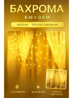 бахрома гирлянда тёплая жёлтая 6 метров на окно
