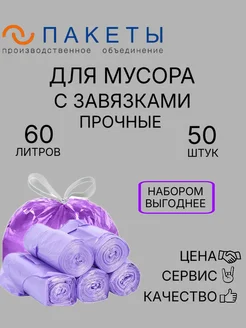 Мешки для мусора 60л 50шт с завязками в рулонах прочные