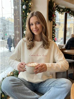 Лонгслив из хлопка однотонный оверсайз с принтом ЛОВЕ