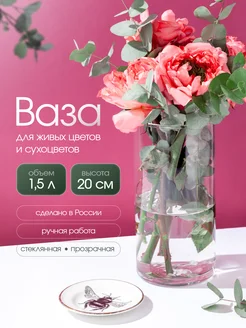 Ваза стеклянная для цветов и сухоцветов прозрачная 20 см