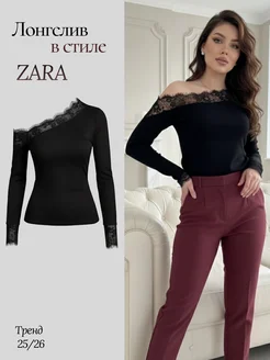 Лонгслив облегающий с кружевом и открытым плечом