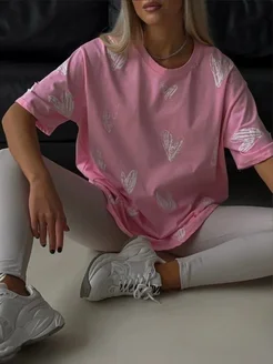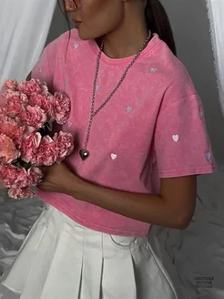Футболка оверсайз укороченная с сердечками