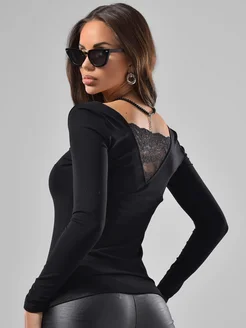 Лонгслив облегающий нарядный с вырезом и кружевом на спине