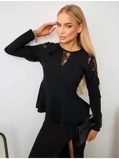 Блузка с баской и кружевом офисная нарядная