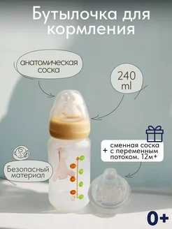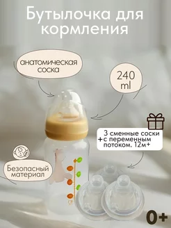 Бутылочка для кормления 240 мл + соски 12+ 3 шт