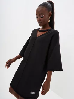 чёрное плотное платье-туника с чокером оверсайз с карманами