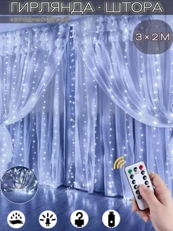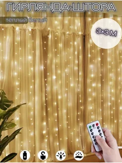 Гирлянда-штора "Роса" 3х3 светодиод пульт USB теплый-белый