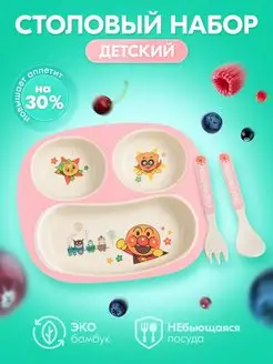 Детский столовый набор, тарелка, ложка, вилка, цвет розовый