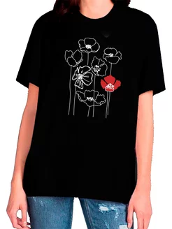 футболка женская плотная Маки чб и один красный