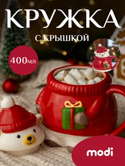 Кружка с крышкой керамическая мишка новогодний подарок