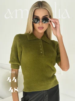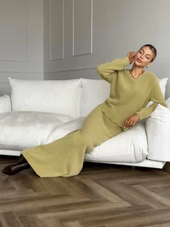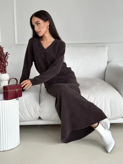 Вязаный трикотажный пушистый костюм с юбкой макси осенний