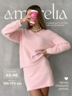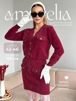 Вязаный пушистый костюм теплый с юбкой