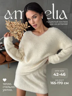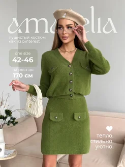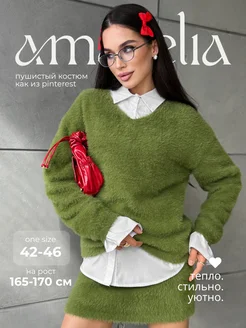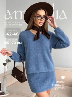 Вязаный пушистый костюм теплый юбкой