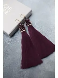 Серьги кисточки из ниток темно-бордовые длинные вечерние