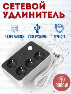 сетевой 3 розетки, 2м с выключателем USB type-C