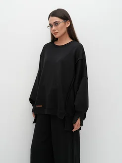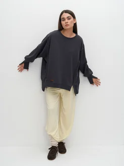 Свитшот оверсайз удлиненный из футера теплый с разрезами