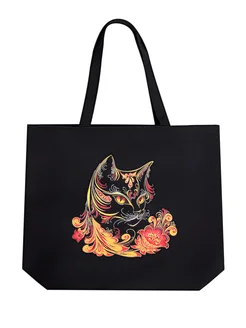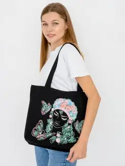 Сумка шоппер тканевая через плечо большая черная с принтом