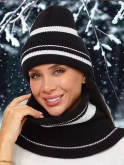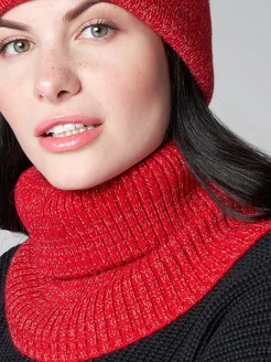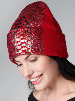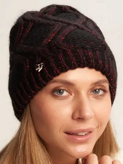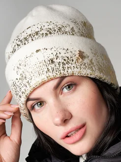 Шапка бини зимняя вязаная из шерсти с отворотом и люрексом
