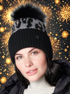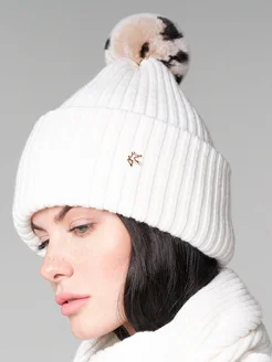 Шапка бини с отворотом и помпоном вязаная из шерсти и меха