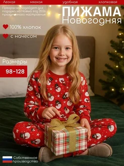 Детская пижама новогодняя в клетку трикотажная с принтом