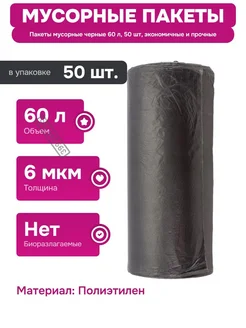 Мешки для мусора 60 литров 50 шт рулон полиэтилен черные