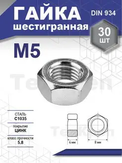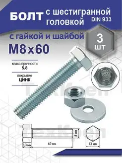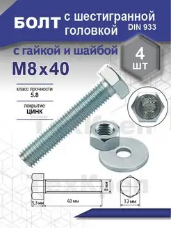 Болт шестигранный с гайкой и шайбой, DIN 933 кл 5.8, цинк