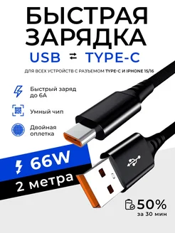 Кабель USB Type-C 2 метра 66W 6A быстрая зарядка