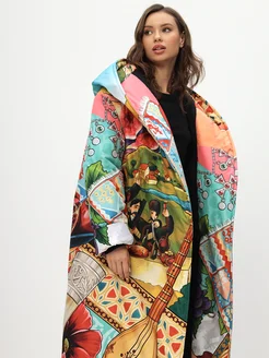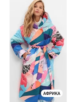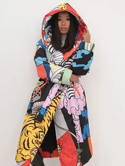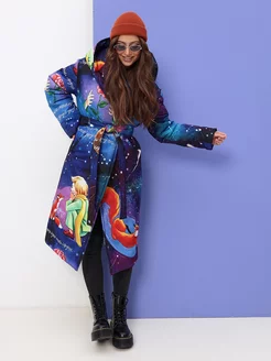 Пуховик зимний с капюшоном, длинный, теплый с принтом