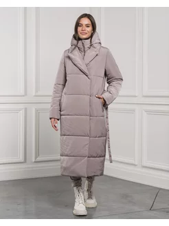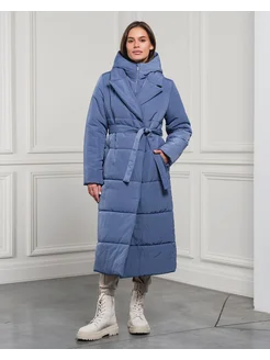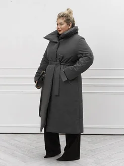 Длинное утепленное пальто на изософте с поясом и молней