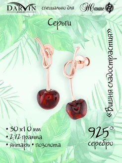Серьги пусеты серебряные позолоченные с янтарем. Вишни