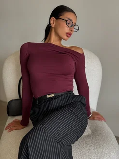 Лонгслив облегающий бордовый с драпировкой на одно плечо