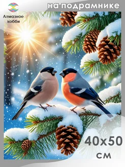 Алмазная мозаика на подрамнике Снегири и шишки 40х50