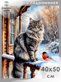 Алмазная мозаика на подрамнике Кот и снегирь 40х50 см