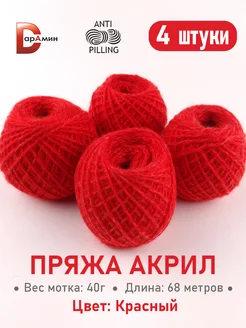 Пряжа для вязания спицами Акрил Красный 40г. 4 мотка