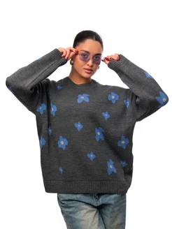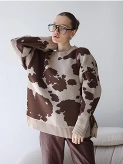 Свитер оверсайз длинный вязаный с принтом