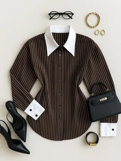 Рубашка клеш коричневая полоска с акцентным воротником
